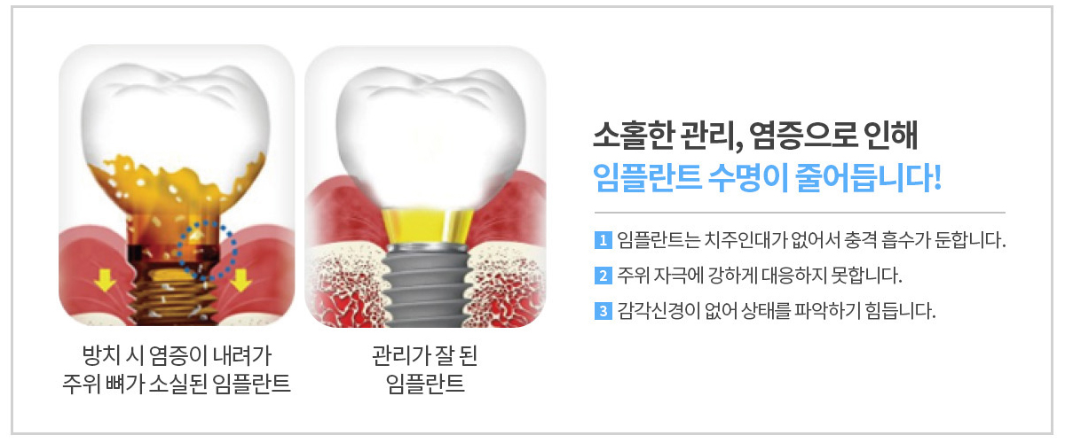 임플란트에는 신경이 없어 관리가 소홀할 경우,